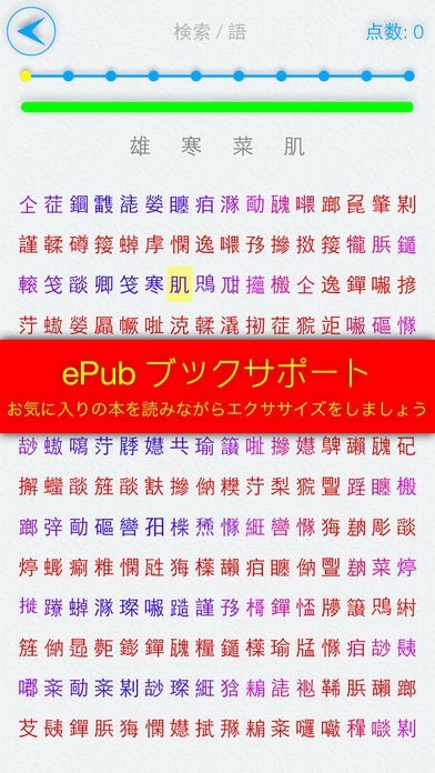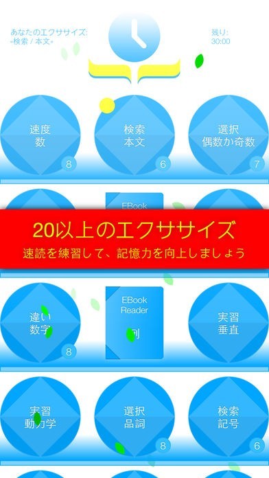 数字や記号、漢字や音声まで多様多種のトレーニングセッションが用意されています。またePubブック機能を使えば、お気に入りの本を読みながら速読力を鍛えることができます。