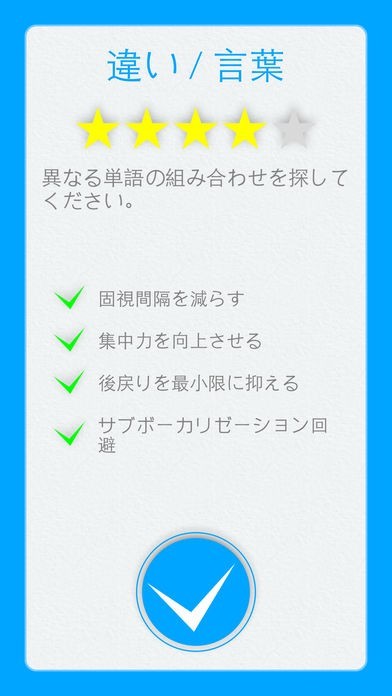 速読をしたときに読み間違えやすい漢字を正しく認識するトレーニングセッションが組み込まれています。また異なる単語の組み合わせを探し出すセッションでは、読みなおしや固視間隔の減少といった速読力スキルアップが期待できます。