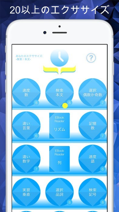 速読のスキルと記憶力を鍛えるための演習が20以上あります。いくつかの演習は、 ePub ブックをサポートします。お気に入りの本を読みながら鍛えることができます! このアプリは英語、スペイン語、イタリア語、ポルトガル語、ロシア語、マレー語、インドネシア語、フランス語、トルコ語、日本語、中国語、朝鮮語、ドイツ語の13言語に翻訳されています!