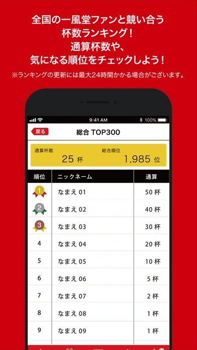 3. 全国の一風堂ファンと競い合う杯数ランキングや、お誕生月特典、最新ニュースの配信も!