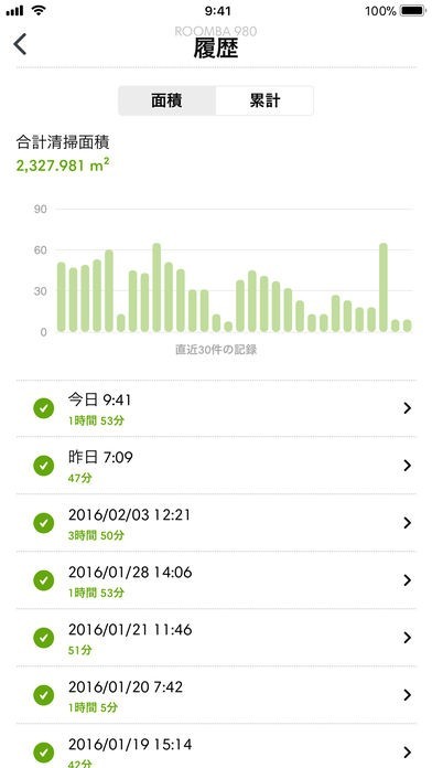 清掃履歴の表示することができます。最大で30回分の清掃を遡って表示できる他、合計清掃面積や掃除時間なども教えてくれるのが便利なポイント。掃除の頻度を確認したい時にも役立ちます。