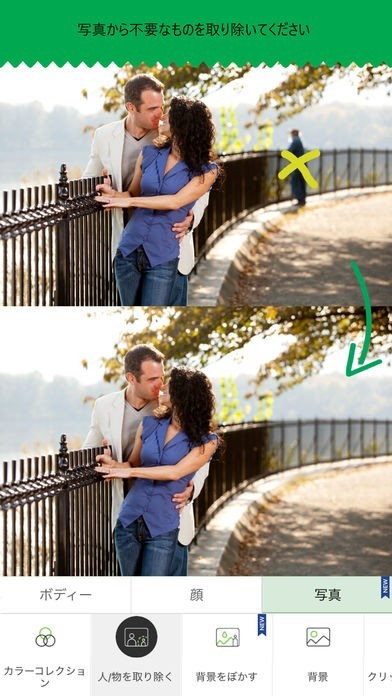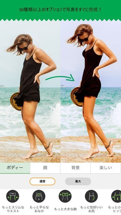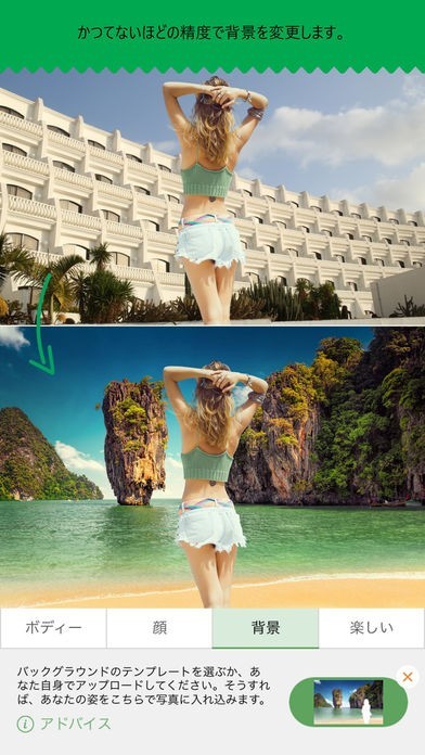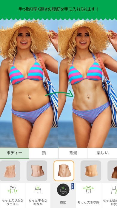 RetouchMeには自分の顔やボディをより美しく見せるための機能が詰まっています。スライドバーを操作したり、指先で細かな調節をするなどの面倒な作業は必要ではありません。画面の下に並んで配置されているボタンをタップするだけで自動で調節を行ってくれる機能が売りです。スリムにしたりおなかを平らにしたりと漠然としたイメージであっても理想どうりの補正をかけることができるので、アプリをうまく使いこなす自信がない場合や画像編集に時間をかけたくないというシーンで活躍します。また、面白い機能が、背景を変えることができる機能です。行ってみたい観光地の写真を使って旅行気分が味わえます。