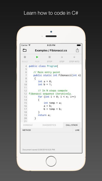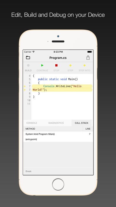 The app compiles and runs your programs directly on your device - no internet connection si required. The built-in C# interpreter is optimized for iOS and gives you the full power of C# right on your device.