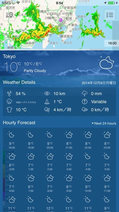 各種レーダーは情報が細かく、温度・降水確率・風速・気圧・UV指数などの情報がチャートとしてひと目で分かり、このアプリだけで、天気に関する情報をまとめて知ることができます。