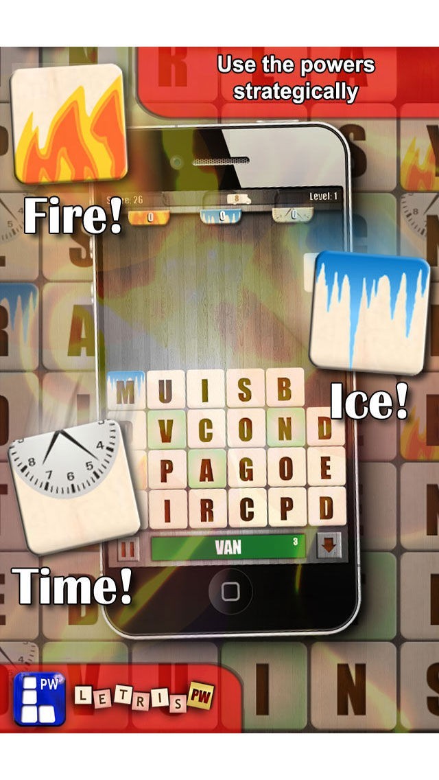 App Storeより引用Letris Power stems from the same simple and addictive gameplay which has turned Letris into one of the most played word games in the AppStore, adding a new strategic factor: 3 different powers to be saved in order to use them at the most convenient moment and thus be able to clear more levels.