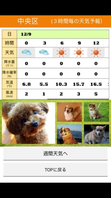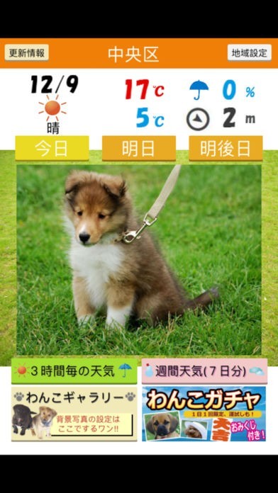 お気に入りのわんこ写真と一緒に天気予報が見られます。