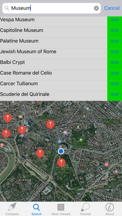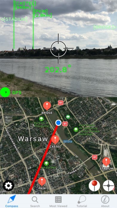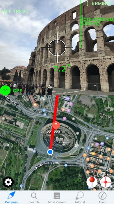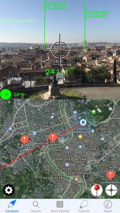 カメラ画面上に現在見ている方向をAR表示してくれるため便利です。また、航空写真の表示によって現在地の把握も容易にできます。また、主要スポットは航空写真上でピン表示されるためわかりやすいです。