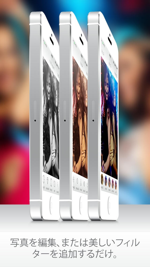 自動の強化機能、ビネット、フォーカス、調整、効果、配置、トリミング、赤目補正を使って写真を瞬時に編集、または美しいフィルターを追加できます。