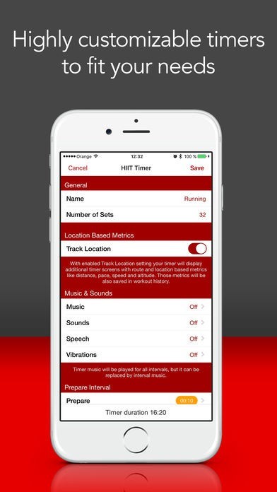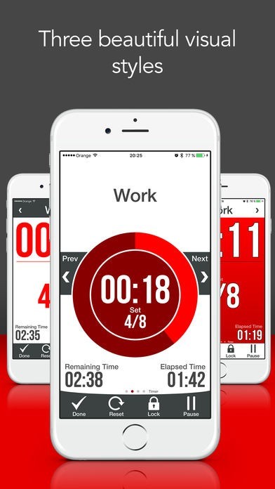The user interface is designed to be clear and readable from a distance. For notification can be used vibrations, sounds and also text to speech voice. No more looking at the screen to know the current interval. Each timer is composed from intervals. Each interval has a configurable name, duration, color and music. Music can be set also for whole timer.