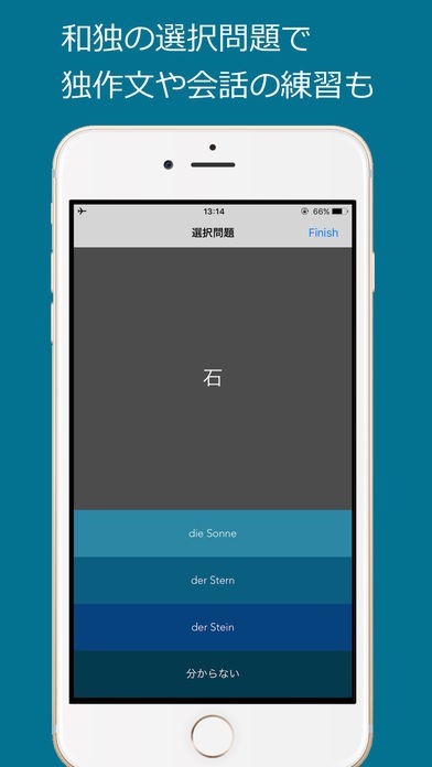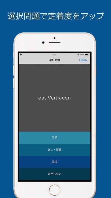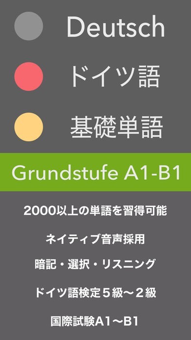 暗記モードや選択問題、リスニングモードやテスト問題と4種類の学習パターンで飽きることなく2,000語以上のドイツ語を学習していき、語彙をしっかりと定着させることができます。