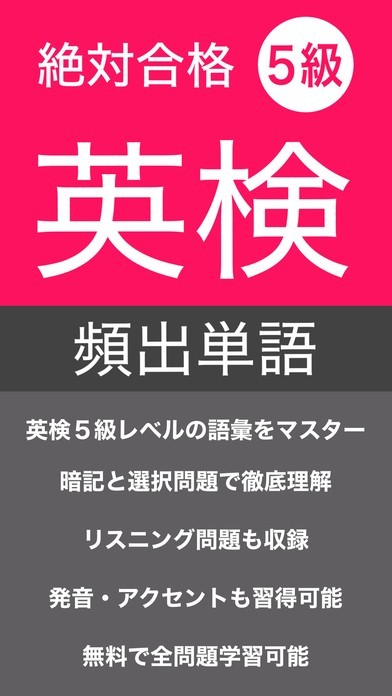 このアプリは英検5級レベルの「単語力」「リスニング力」「会話力」を鍛えるためのiPhone / iPad アプリです。4つの学習パターンを繰り返しこなすことで、英検5級合格レベルの英語力を習得可能です。