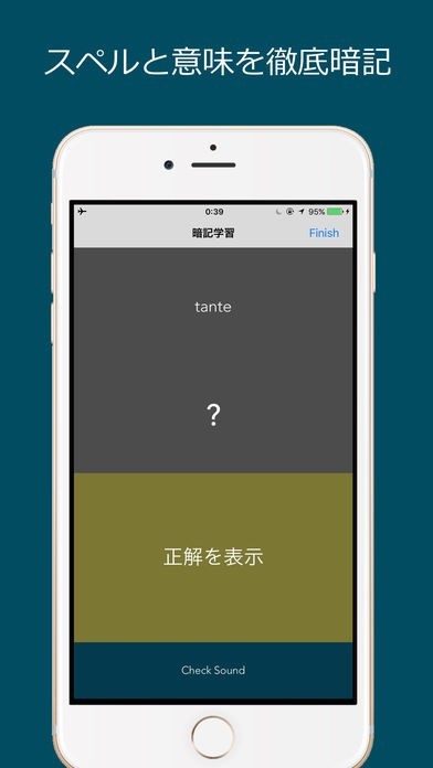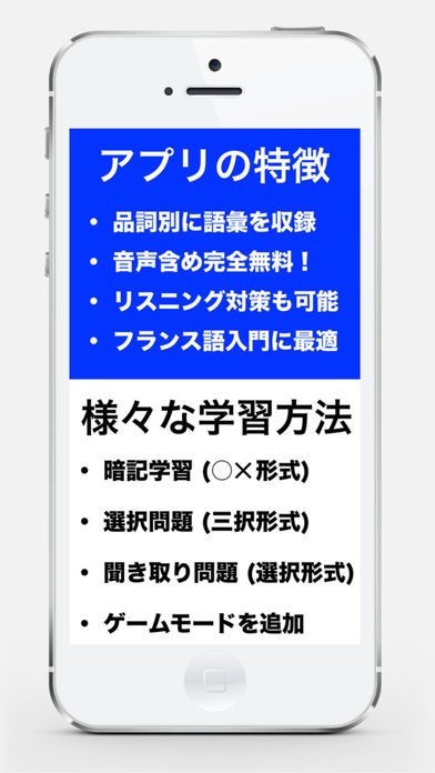 フランス語初心者向けに必要な約230のフランス語の単語が収録されています。単語が音声と共に表示されるので、意味を覚えるのと同時にリスニング力も鍛えられます。単語は品詞ごとに分類されているので覚えやすいです。カードをめくるように単語が次々に表示されて、意味が分かれば○、意味が分からなければ×を選ぶだけでいいので時間をかけずに暗記していけます。暗記できたかどうかを確認できる問題も用意されていて、3択の中から正しい意味をタップして解答します。リスニング用の問題もあるのでリスニング力もチェックできます。結果は保存されるので間違った問題を効率的に復習できます。