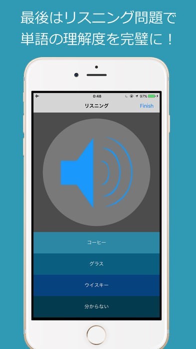 三択問題では、日本語からの選択問題で、作文や会話の練習を行います。リスニング問題では、音声だけが流れるので、それに対応する日本語を選択しましょう。分からない場合は画面をタップすれば、スペルが表示されます。