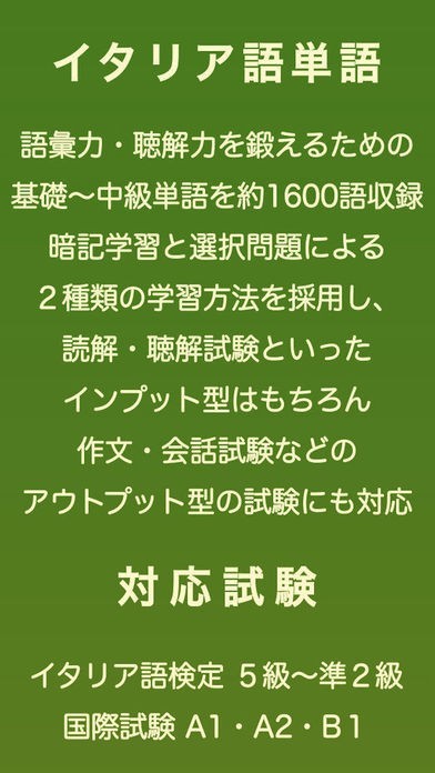 App Storeより引用このアプリはイタリア語の「単語力」と「リスニング力」を鍛えるためのiPhoneアプリです。1ヶ月の学習で1600単語を覚えることが可能です。もちろん、音声もすべて無料です。
