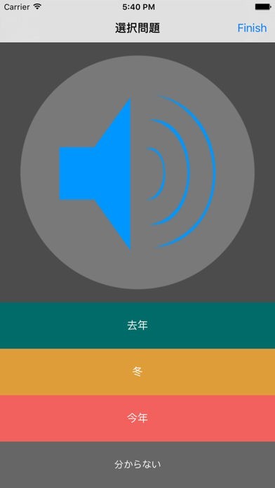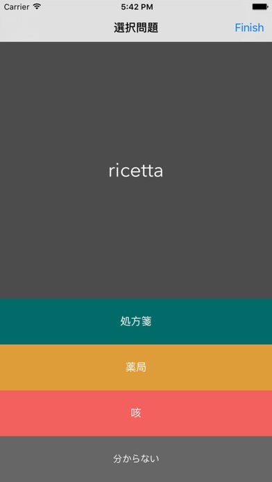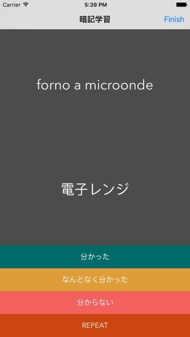 ここでは単語を聞き取るトレーニングをします。スピーカー(イヤホン)から流れてくるイタリア語単語に見合う日本語を選択します。分からない場合はスピーカーのアイコンをタップすることで再度音声が流れます。それでも分からない場合は「表示」ボタンをタップすることでスペルが表示されます。結果は成績部分に保存され、あとから間違えた問題のみを学習することもできます。