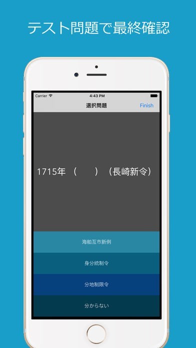 毎年大学入試に出題される日本史の年号や人物、事件について暗記学習と選択問題でしっかりと記憶を定着させることができるアプリです。テスト問題で最終確認することができます。