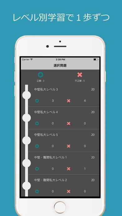 レベル別学習機能有り。間違った問題を確認する機能もある!