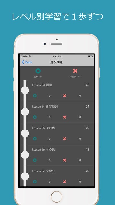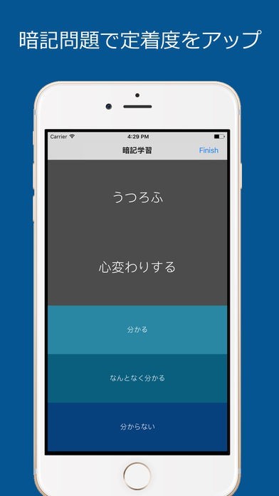 センター試験や私立大学の受験国語では、古文単語の意味が分からなければ解けない問題が出題されています。また、単純に古文単語の訳が問われる問題も多くこういった知識問題を落とすことなく得点源へと変えることが合格への近道となります。このアプリでは、受験で出題されることが多い古文単語を基本として、実力を付けられるように学習が進められます。主な目的は暗記であり、知っている単語と知らない単語とを区別させられます。結果に応じて成績が開示できるので自分の現段階の実力を把握しましょう。