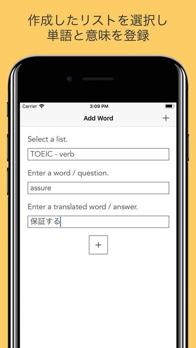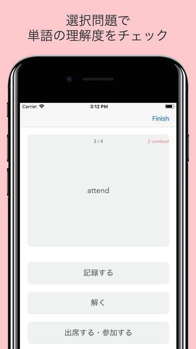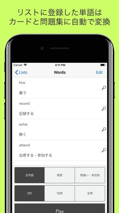 このアプリは単語を登録すれば、自動で問題が作成され、いつでもどこでも気軽に暗記問題と選択問題をこなすことができます。