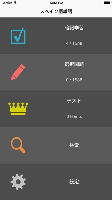 単語を覚えたら選択問題やテストで定着率をチェックすることができます。成績表が作られるので、自分の習熟度、苦手部分を把握できスペイン語学習に役立てることができます。