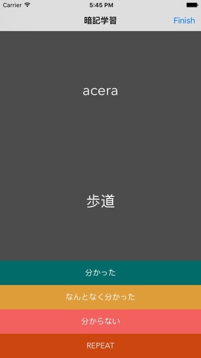 スペイン語の単語の暗記にぴったりのアプリです。単語のスピーカーアイコンをタッチすると、音声を確認することができます。何度もリピート可能です。単語力とリスニング力をつけられます。