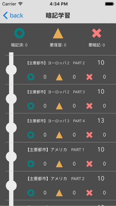 暗記学習では暗記済・要復習・要暗記の3段階で、暗記しているかどうかを記録できるので後から復習しやすいです。選択問題では正誤の記録を成績機能で確認することができます。