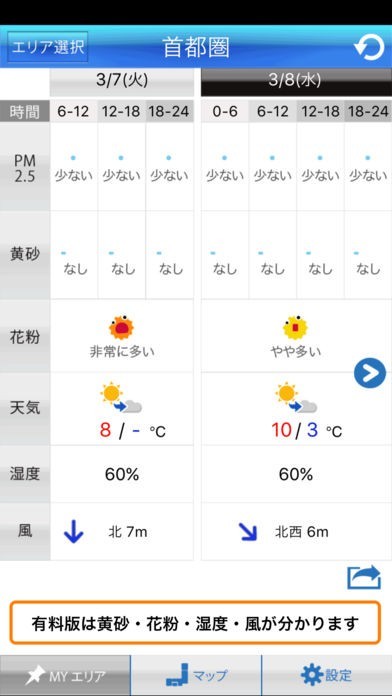 花粉予測に加えて黄砂予測マップが表示出来るので、大気や風の状態をチェックしたい時に魅力でした