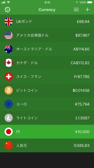 プラスボタンを押して、変換対象通貨を増やすことで同時に数多くの国の通貨レートに変換することができるようになっています。暗号通貨(ビットコインやライトコイン)にも対応しているのも嬉しい機能となっています。