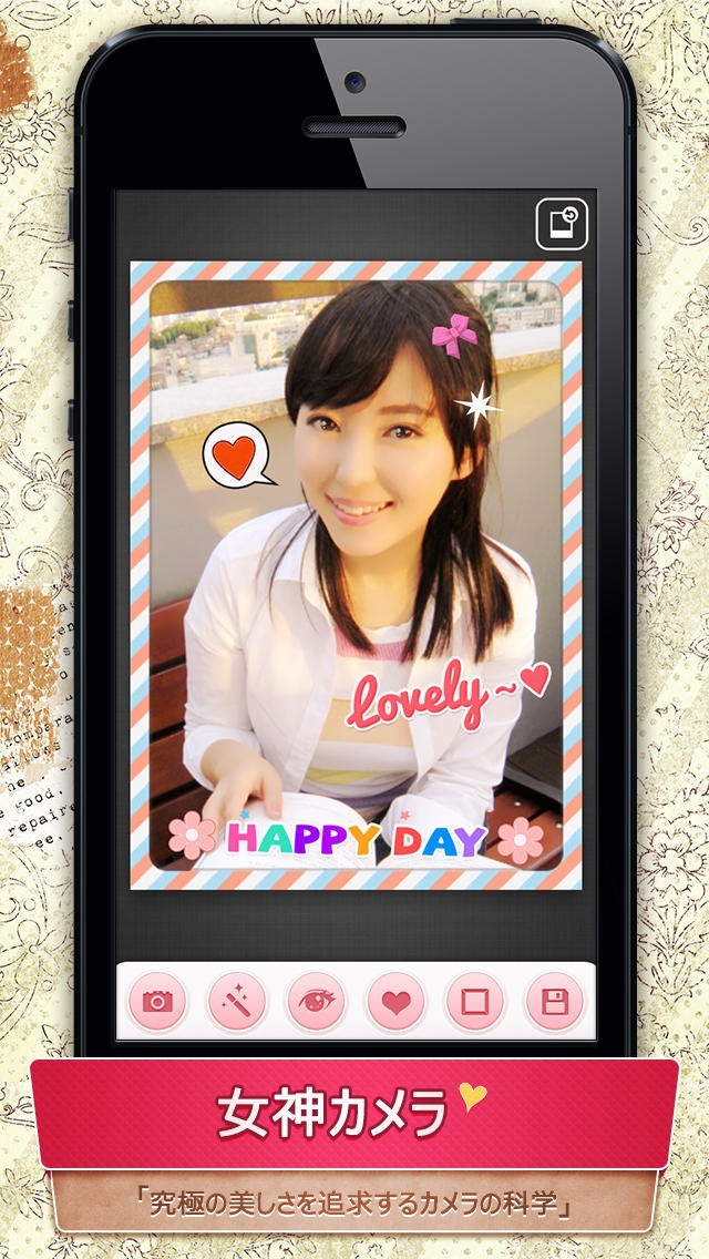 美肌効果や目元修正が行える『女神カメラ』はスタンプの追加に対応したカメラアプリで、自撮りした写真を美しくアレンジ出来る魅力があります。瞳の形や色合いを調整する事も可能ですし、30種類以上のフレームを使ってお洒落な画像に仕上げられるのが機能の特徴でしょう。肌荒れの補正やクマの除去も行えるため、プロフ写真を撮りたい時に役立ちます。また自動で目や顔を認識してくれるので、自然に加工出来るようにもなっています。SNSへの投稿に対応していて、周囲に素早く共有していけるのも利点です。メッセージスタンプや肌トーンの種類が豊富なので、日常写真を魅力的な1枚へと変貌してくれます。