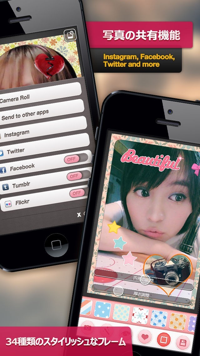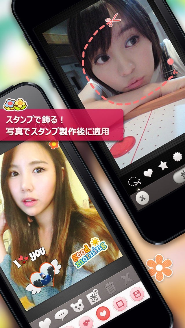 写真が完成したら、スタンプ機能でかわいい星やハートなどのデコ素材を使ったりフレームで編集