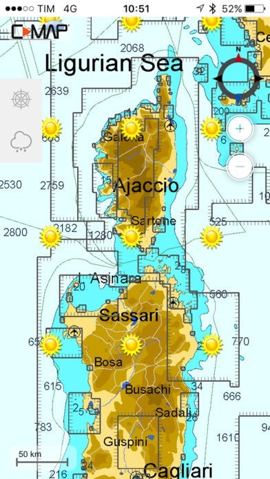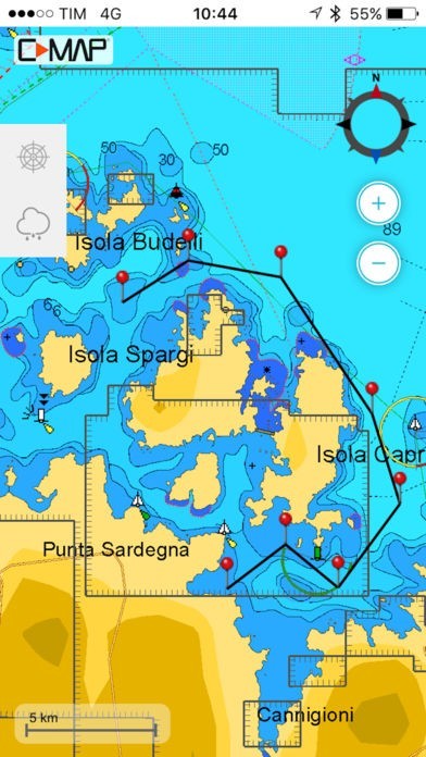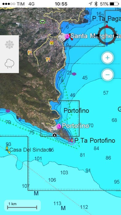 このアプリを使い表示された海図をタップすると、その位置の緯度経度の情報や周囲に何があるのか、といった確認ができます。またネットにつながる環境だと気象予報のデータなどもダウンロード可能です。