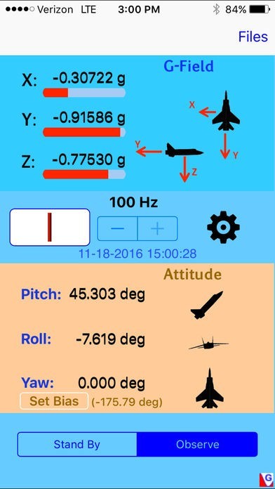 Just as with GFR, this app is a tool for recording 3-axis acceleration fields and rotational displacements of the iPhone and iPad, allowing the user to record three orthogonal acceleration field measurements and pitch, roll, and yaw over a large range of sampling frequencies.