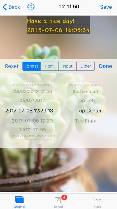 App Storeより引用Add timestamp to photo and video easily and save to a new file. It's the most powerful app to add timestamp on video. You can change time format, position, font, color and size. By this app you will know when the funny or important moment happened after a long time. You can also print the photo or burn the video to DVD without losing the time.