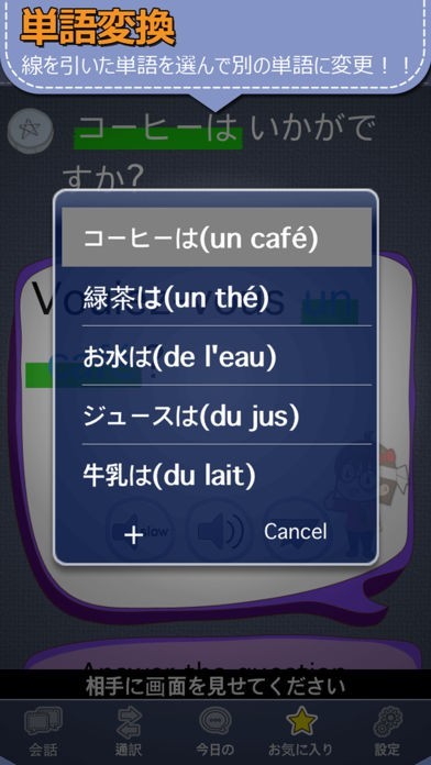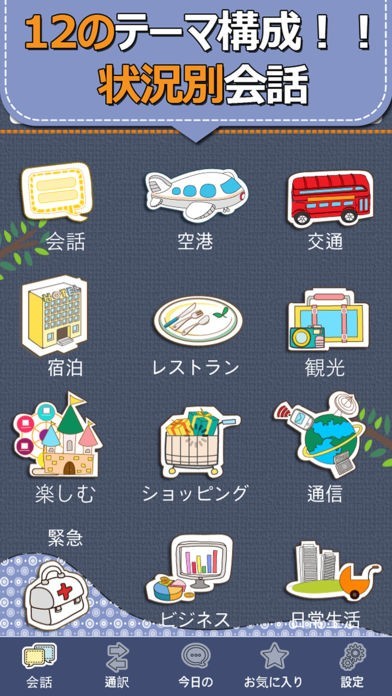 App Storeより引用これからはレストラン、町中、海外旅行で外国人に声をかけられても自信もって言いえる!会話の中予想される答え、そして文書の内容を変更し、様々な状況を演出・学習できる新たな語学アプリ。