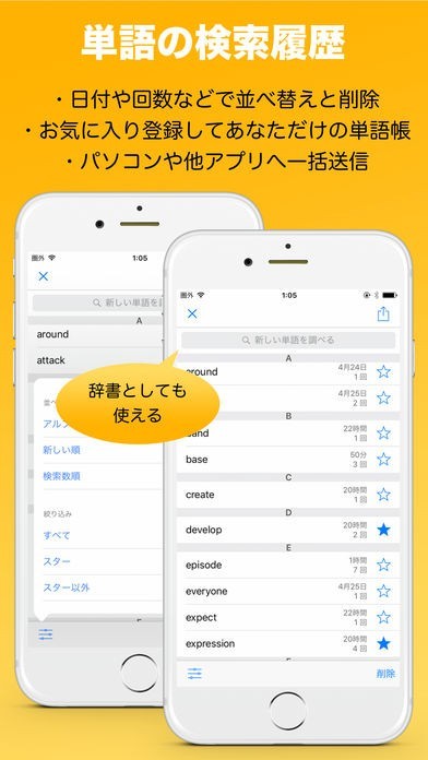 英文を読んでわからない言葉はワンタップで任意のオンライン辞書で表示できます。検索履歴も確認でき、お気に入りに登録すれば自分だけの単語帳を作ってしっかり学習できます。