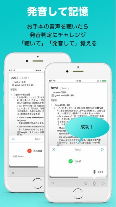 音声再生・認識機能が搭載されており自分の発音をチェックすることができます。お手本の発音も聴けるので正しい発音が身に付きます。テスト機能つきで苦手な単語もしっかり覚えられます。