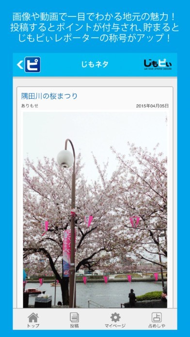 「じもピぃ」では、地元の穴場の情報を投稿することが出来ることから、他の地域から来る方に感謝されたり、同じところを知っているというような方との共通項であるので、それをきっかけに話が進んでいき、仲良くなれたりもします。 お気に入りのものがあれば、「Good!」を押すとあとからマイページでそれらを確認できるので、それをもとにして旅行の計画を立てることもできるでしょう。 他には「占めし屋」によって、週に一回だけ占いをしてくれるので、自分の運を確認してみて生活に活かすのもいいでしょう。