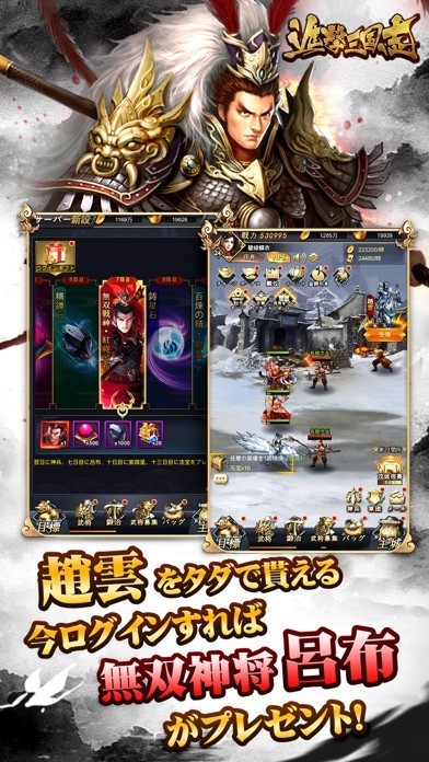 毎日様々なボーナスを受け取れる、更にゲームの中でビッグ「御年玉」をタダで貰う!元宝を次から次へとプレゼント、ログインすると三国の飛将呂布(SSR)を入手できる!彼の助力で三国の制覇を完成しよう!