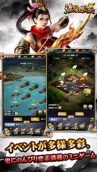 多様なミニゲームでリラックスできる、薬院の培植収穫、採掘と競争、草船借箭の計...他にも城塞の報酬、無料元宝とアイテムのイベント、リラックスもボーナスも全部手に入る、強くなるのに苦労しない。