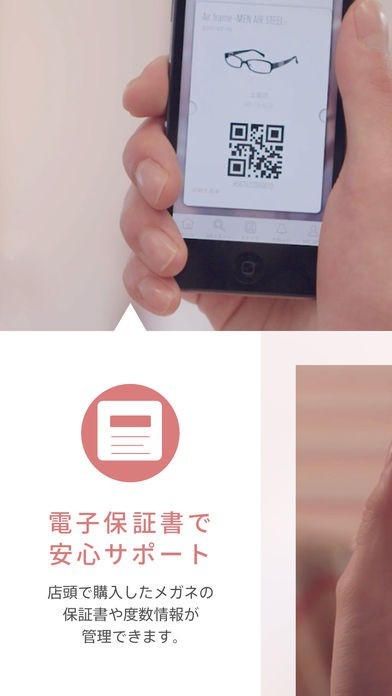 購入したメガネの保証書がアプリで保存できるから安心。バーチャルでメガネの試着もできるから良い。