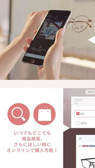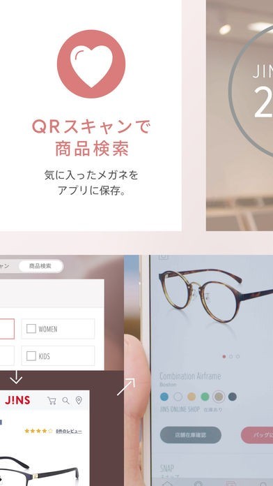 「JINS」はアイウェアブランドのJINSに特化した公式アプリで、購入者は電子保証書の管理アイテムとしても利用できます。購入者以外でも活用できる点がポイントとなっており、商品検索だけでなくオンラインショップに移動してお買い物も楽しめます。さらにスマホカメラを使ったバーチャル試着機能も備えていますので、店舗に行けなかったりメガネが初めてだったりでも気軽に試すことが可能です。実際に店舗まで訪問した場合、気になる商品はレンズのQRコードスキャンでアプリ内に登録できます。