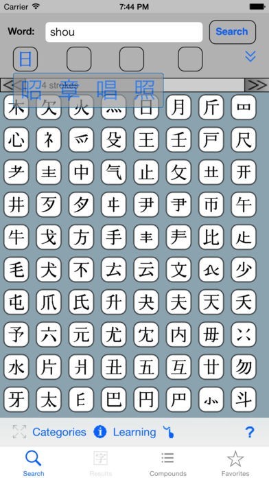 Lookups are element based, using the original system of 632 basic visual elements. No need to count strokes, JiShop’s radical-based dictionary does the work for you. The table of radicals allows you to fully specify any kanji.