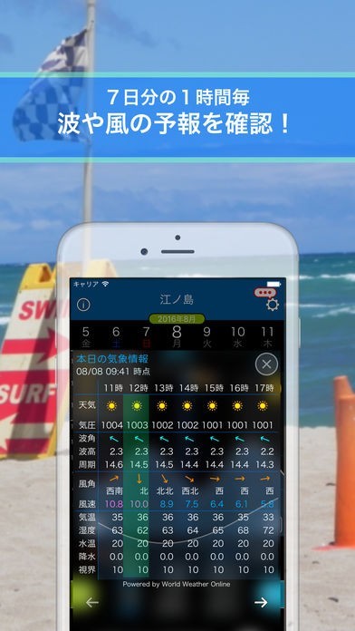昼夜を問わず全国のサーフィンができる海の風や波の状況を調べることができるなどサーファーには必須ともいえる機能が充実しています。一週間先の予報を調べることができるため、サーフィンを友達と予定している場合には事前の計画が練りやすくなります。また、予報は一時間ごとの予報がなされているなど細かいポイントも評価されています。また、わざわざアプリを起動しなくてもロック画面から波の状況をチェックすることができます。グラフ化されているので視覚的にも情報を掴みやすいことが特徴の一つです。万が一天候が悪そうな場合は天気予報も併せて調べられるのが非常に便利です。