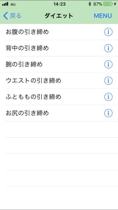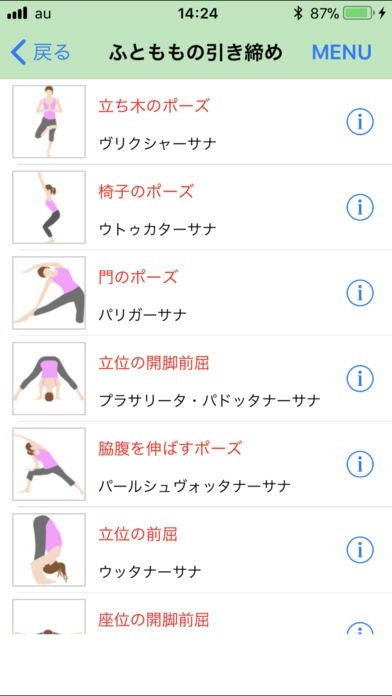 ダイエットや美容、リラックスなど目的を選び画面をタップすると、それぞれの細かい部位・コースが並んでいます。例えば、ダイエットはお腹に引締めに始まり、背中の引き締め、お尻の引き締め等です。コースを選べば選択したコースに一番効果的なポーズが表示され、解説してもらえます。自分がやりたいヨガポーズを簡単に探し出せます。