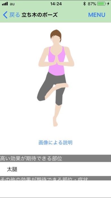 自宅でアプリを見ながらヨガで健康・ダイエット・症状改善・リラックス効果を体験できるアプリです。初心者でも簡単にヨガを楽しめるよう、30のポーズを解説しています。ヨガをしてみたいけれど、教室に通うの面倒という方にピッタリのアプリで、ちょっとした場所があればヨガをすることができます。基礎代謝アップ、綺麗なボディラインの為だけでなく、リラックス効果も高いヨガですので、仕事の合間の休憩時間などのちょこっと隙間時間にヨガを楽しめるアプリとなっています。
