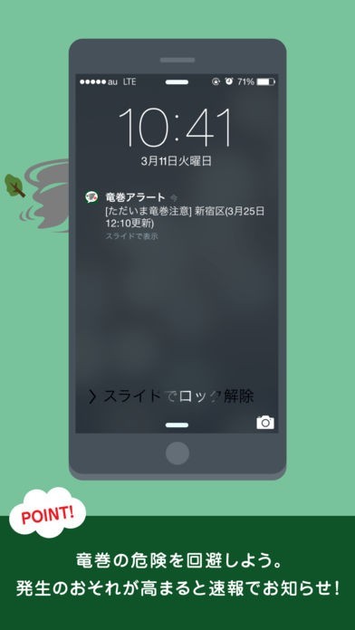 竜巻情報を素早く取得アラート搭載で竜巻発生の可能性を提示してくれる