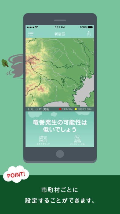 発生時には大きな被害をもたらしかねない竜巻の情報配信に特化した「竜巻アラート: お天気ナビゲータ」では、竜巻発生の可能性が高まった際にアラートでお知らせしてくれます。市町村ごとに情報の設定ができるなど、自分の住む地域に合わせてアプリを使うことができるようになっており、竜巻情報を素早く取得することができます。