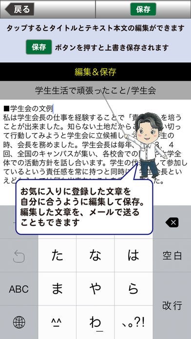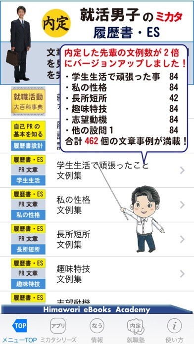 App Storeより引用就活男子のための履歴書・エントリーシート(ES)の文例462個を収載したアプリです。