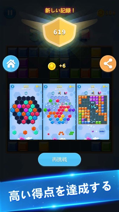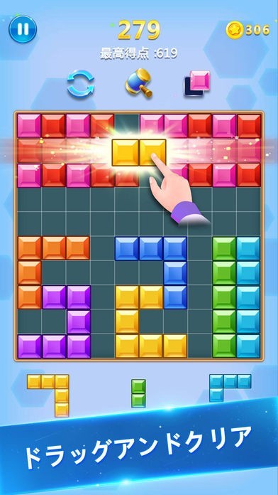 ドラッグモードでは画面下部に現れる3種類のブロックをフィールドに配置し、縦1列か横1列を揃えて消していきます。ハイスコアを競うことができるので、何回でもやりこめます。