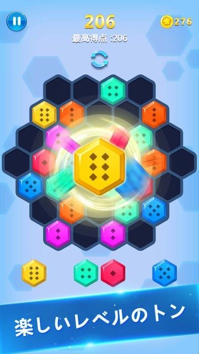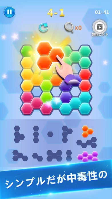 六角形が複数繋がったブロックを、ジグソーパズルの要領で決められた枠にはめていく六角形ジグソーでは、4段階の難易度で80ステージずつプレイできます。クリアするだけでなくクリアタイムも競えます。